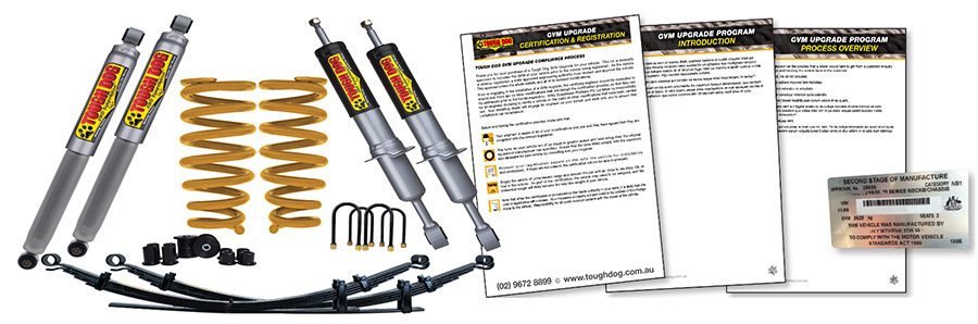 The GVM of any vehicle is the weight in kilograms that the manufacturer has specified as being the maximum that the vehicle can weigh when fully laden. Tough Dog GVM upgrades allow a vehicle to be certified to carry a greater amount than the original manufacturer, without breaching applicable ADRs or laws.